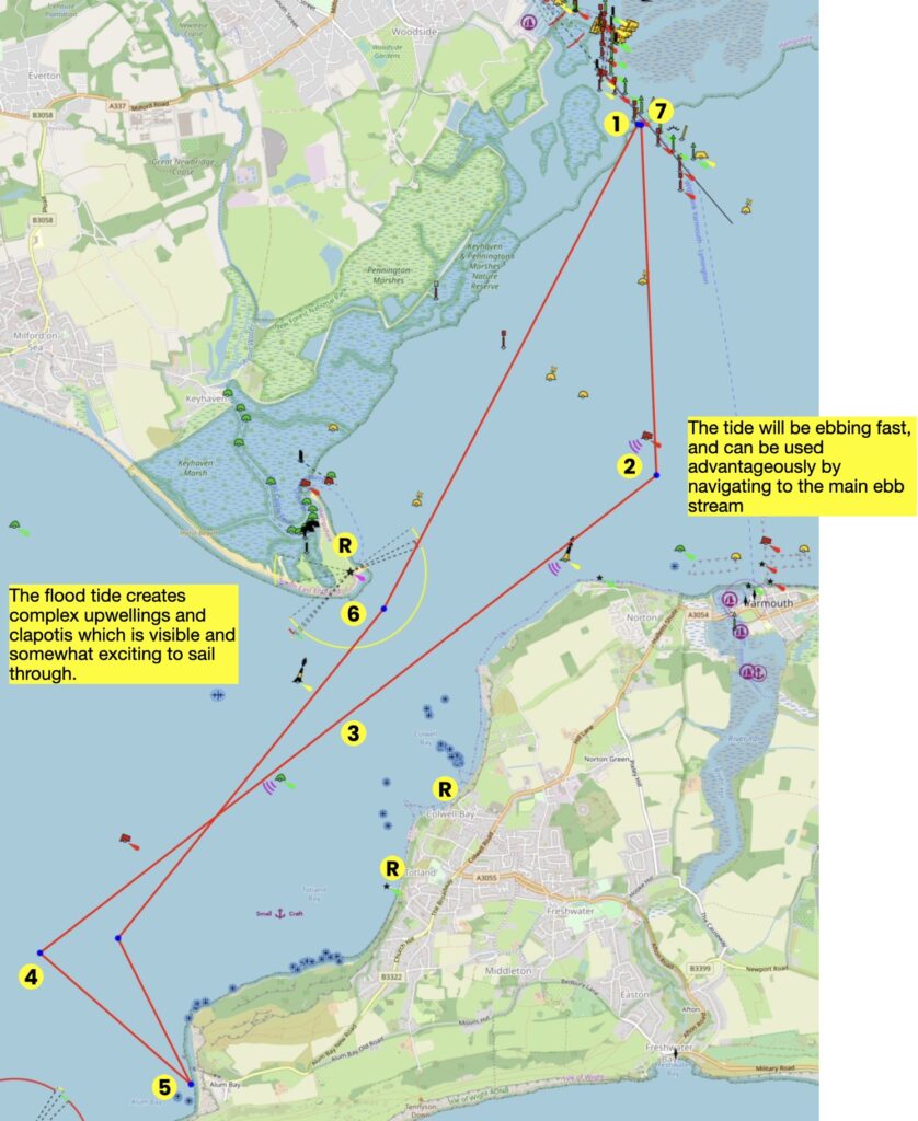- Assuming that you are doing this on an ebb tide with a low water about 13:00 to 14:00 and you are leaving about 10am, there is a strong ebb tidal stream pouring out of the Easter Solent – so aim South and once beyond the Port Hand deep water mark, follow the deep water channel as the tide whisks you West