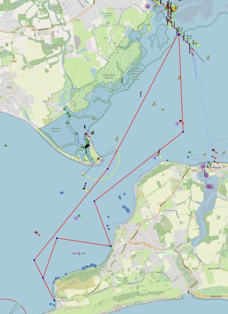 It is best to pick a day when the low tide is between 13:00 and 14:00 because the gap between Hurst Point and the Isle of Wight is a “tidal gate” and we sail with the Ebb on the way out, and with the Flood on the way back. The tide is very strong in both directions.