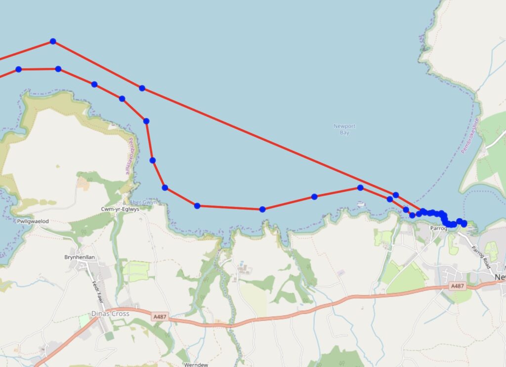 Tidal Information: The tides can reach 3 knots around Dinas Head, but are weak apart from that. Newport estuary is only accessible a couple of hours either side of HW (Milford Haven +0115). The tide flows NE from about HW -3 and SW from HW+3. So a good time to leave is around 3 hours before HW