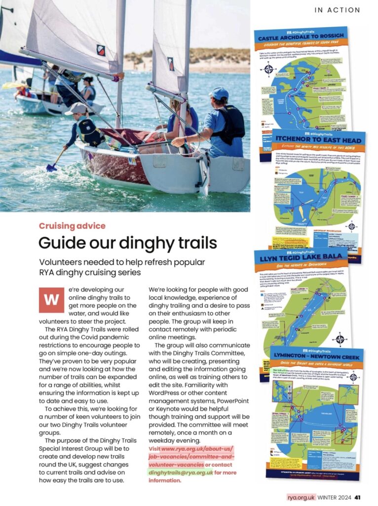 The Dinghy Trails project is advertised in the December 2024 edition of the RYA Magazine, including the ways to get involved. If you are interested in keeping the Dinghy Trails up-to-date, and adding to them, please volunteer.